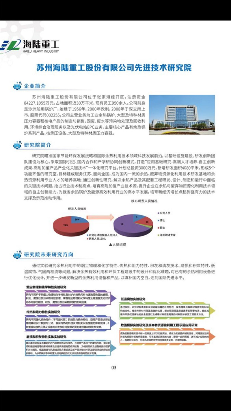 海陸重工一直秉承“科技領(lǐng)航,業(yè)界先鋒”的經(jīng)營理念,專注于流程工藝中余熱、廢熱回收與環(huán)保技術(shù)相結(jié)合的技術(shù)研發(fā),主營業(yè)務(wù)為主工業(yè)余熱鍋爐、大型及特種材質(zhì)壓力容器和核電產(chǎn)品的制造與銷售,固廢、廢水等污染物處理及回收利用,環(huán)境綜合治理服務(wù)以及光伏電站EPC業(yè)務(wù)。本公司先進技術(shù)研究院瞄準(zhǔn)國家節(jié)能環(huán)保發(fā)展戰(zhàn)略和國際節(jié)能環(huán)保技術(shù)領(lǐng)域科技發(fā)展前沿,以基礎(chǔ)設(shè)施建設(shè)、研發(fā)創(chuàng)新團隊建設(shè)為核心,采取國際引進、國內(nèi)合作和產(chǎn)學(xué)研協(xié)同創(chuàng)新模式,打造“應(yīng)用基礎(chǔ)研究-高端人才培養(yǎng)-自主創(chuàng)新成果-高附加值產(chǎn)品產(chǎn)業(yè)化關(guān)鍵技術(shù)”一體化研究平臺。
