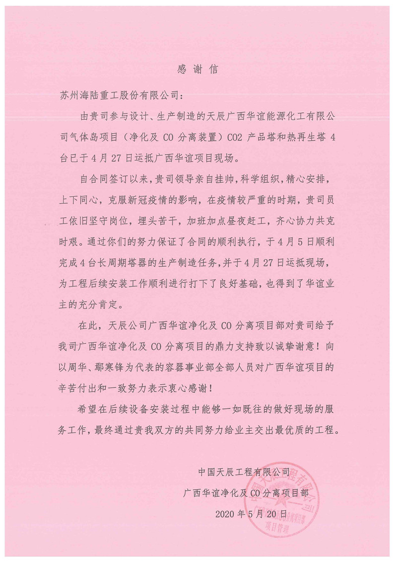 由于年初疫情的影響,廣西華誼項目現(xiàn)場出現(xiàn)了停工等待的不利局面,時間不等人,為保證客戶工期需求,“急客戶所急,想客戶所想”,海陸容器事業(yè)部全體干部職工上下同心,不畏困難,晝夜趕工,克服了疫情等諸多不利因素的影響,最終如期將產品交付客戶手中。
